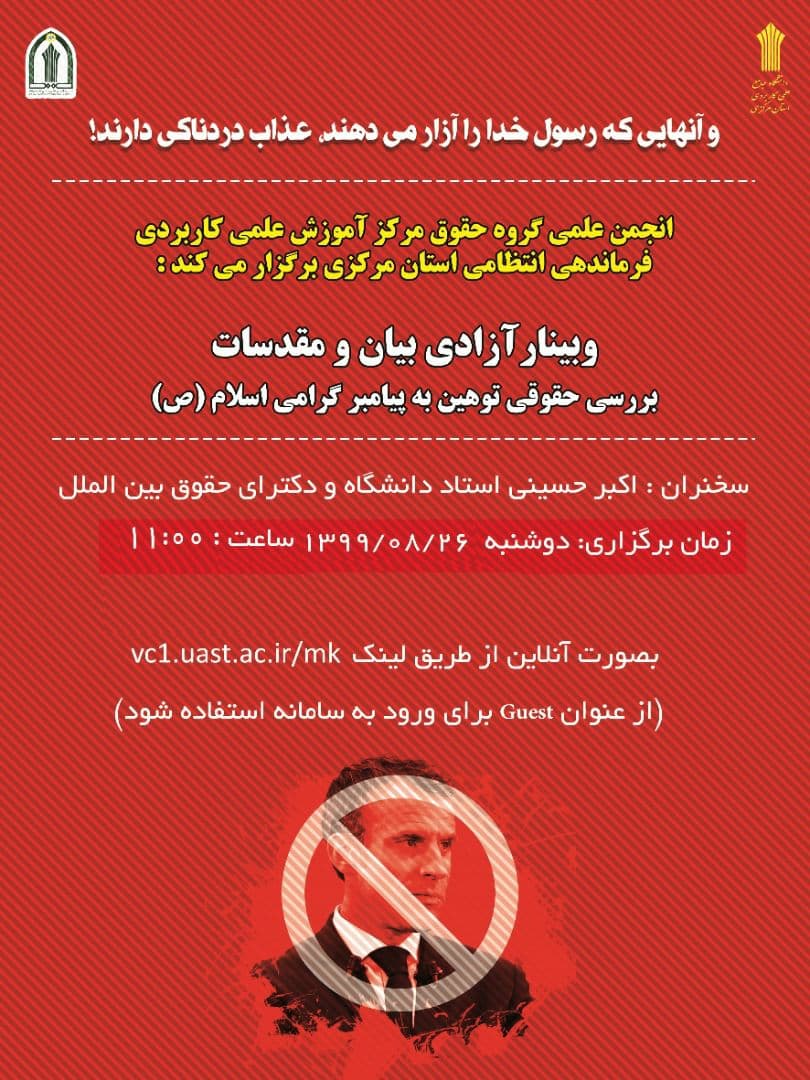 کاربردی استان مرکزی، به دنبال توهین اخیر نشریات فرانسوی به ساحت مقدس پیامبر اکرم (ص) و حمایت رئیس جمهور فرانسه از این عمل قبیحانه به بهانه آزادی بیان، صبح امروز بیست و ششم آبان ماه انجمن علمی گروه حقوق مرکز آموزش علمی کاربردی فرماندهی انتظامی استان مرکزی اقدام به برگزاری وبینار آزادی بیان و مقدسات با موضوع بررسی حقوقی توهین به پیامبر گرامی اسلام (ص) نمود.