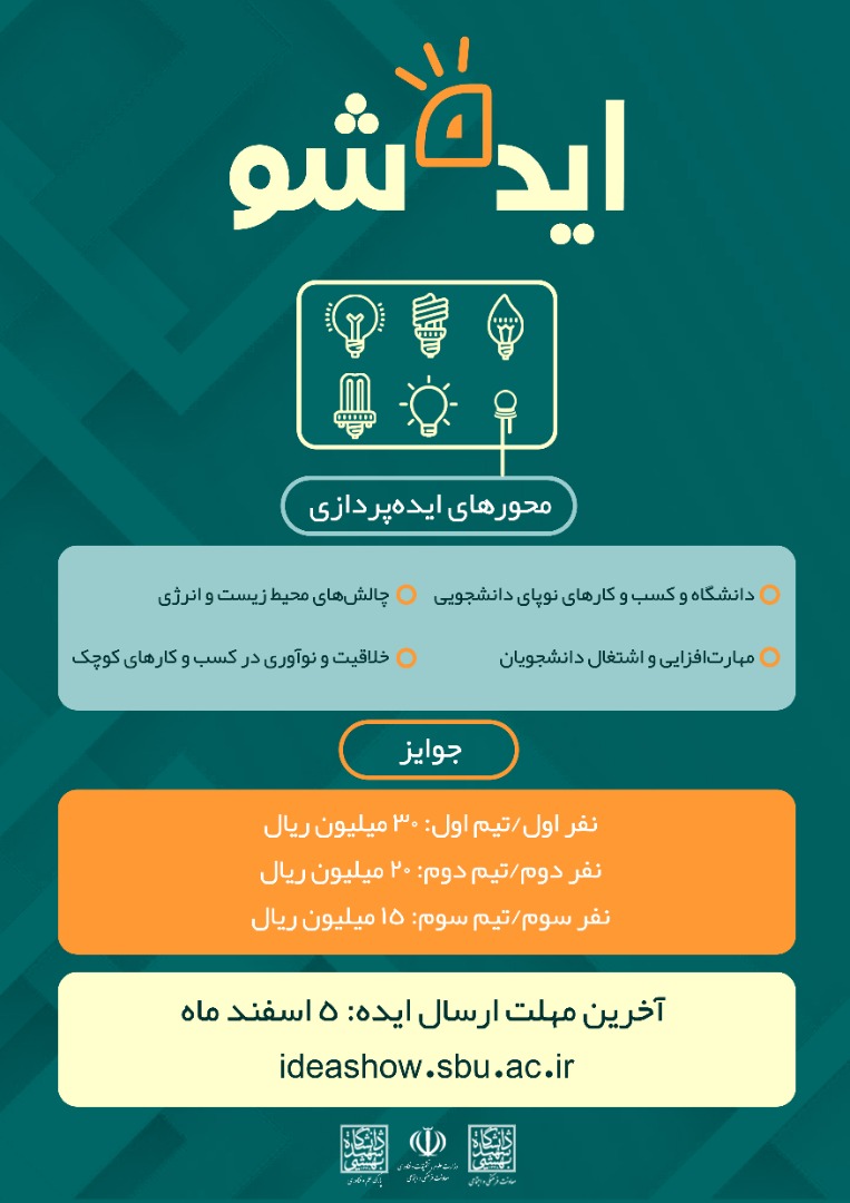 به گزارش روابط عمومی دانشگاه جامع علمی کاربردی واحد استان مرکزی، بر اساس ابلاغیه صادره از معاونت فرهنگی و دانشجوی دانشگاه جامع علمی کاربردی بر اساس بخشنامه مدیرکل فرهنگی و اجتماعی وزارت عتف، به منظور ایجاد فرصتی مناسب برای انتقال تجربههای علمی موفق انجمنهای علمی دانشجویی با هدف همافزایی و همکاری بین آنها، دانشجویان جهت شرکت در "بخش ویژه ایده شو" سیزدهمین جشنواره بینالمللی حرکت تا 5 اسفندماه فرصت دارند با مراجعه به آدرس ideashow.sbu.ac.ir نسبت به ارسال ایده های خود در محورهای بخش ویژه ایده شو با عناوین دانشگاه و کسب و کارهای نوپای دانشجویی، مهارتافزایی و اشتغال دانشجویان، چالشهای محیط زیست و انرژی، خلاقیت و نوآوری در کسب و کارهای کوچک (خانگی، محلی و سنتی) اقدام کنند.