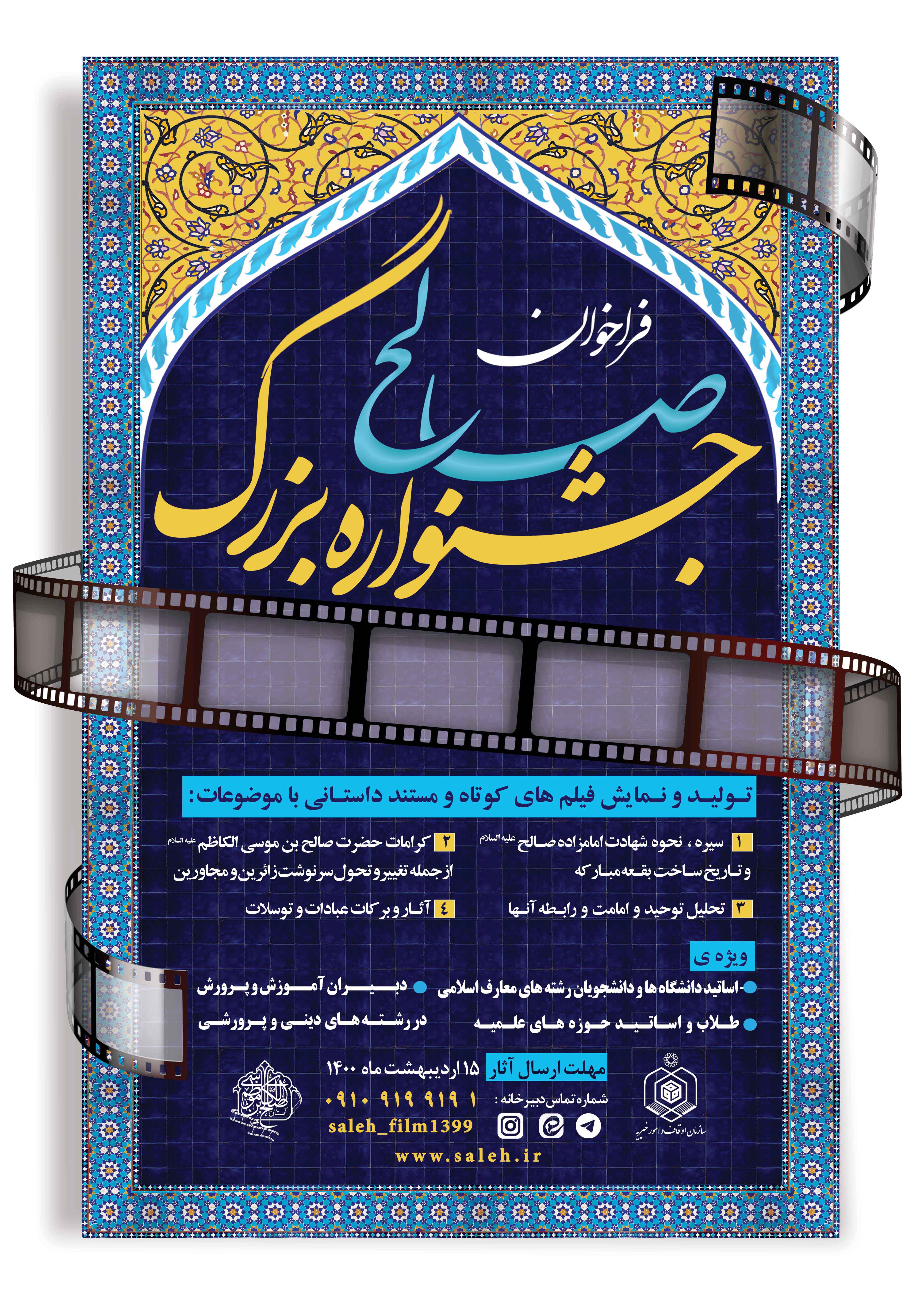 به گزارش روابط عمومی دانشگاه علمی کاربردی استان مرکزی، جشنواره بزرگ صالح با موضوع تولید فیلم داستانی کوتاه، مستند و پویانمایی توسط آستان مقدس حضرت صالح بن موسی الکاظم (ع) و با مساعدت معاونت فرهنگی و اجتماعی وزارت عتف برگزار می شود.